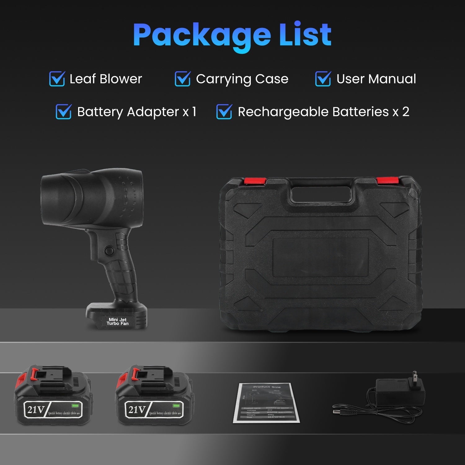 - Includes: 1 Leaf Blower, 2x 21V 3000mAh Batteries, 1 Charger, 1 Carrying Case, User Manual