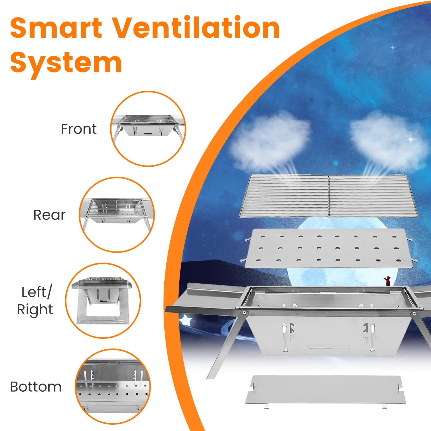 Adjustable fire grate with 3 height settings plus smart ventilation system (24 bottom holes, side air intakes) for precise heat control