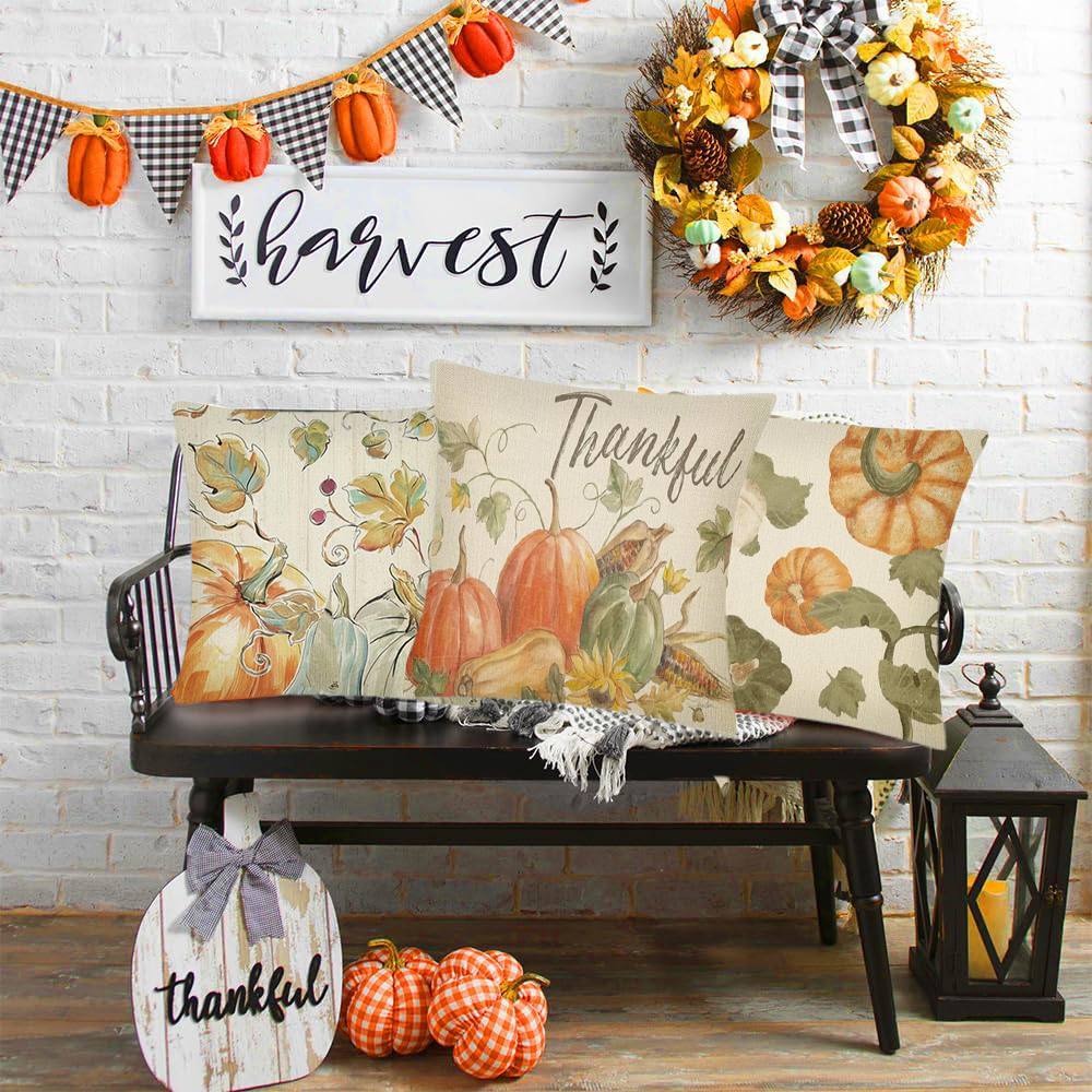 Thanksgiving Fall Throw Pillow Covers Set - 4 Pack Pumpkin Watercolor 18x18
